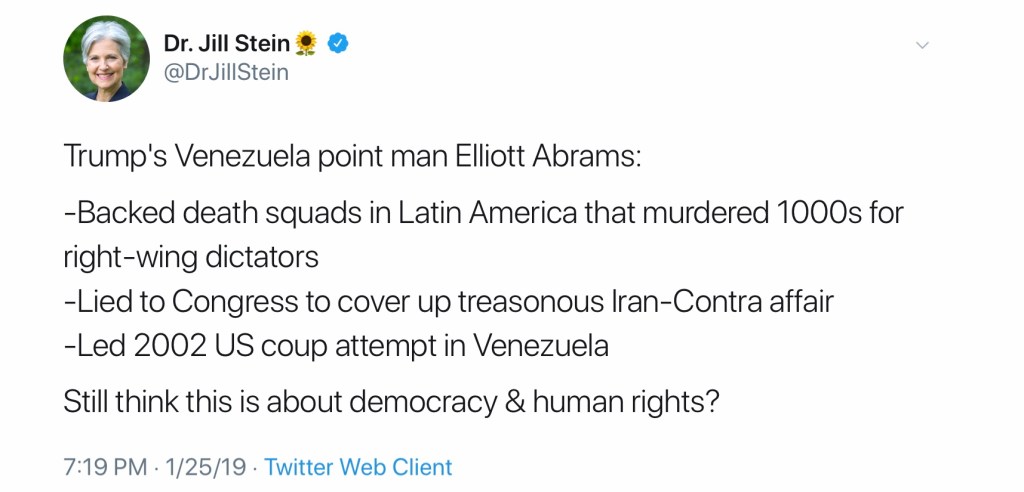 Trump’s Venezuela point man Elliott Abrams Jill Stein (via Twitter): Trump’s Venezuela point man Elliott Abrams: -Backed death squads in Latin America that murdered 1000s for right-wing dictators-Lied to Congress to cover up treasonous Iran-Contra affair-Led 2002 US coup attempt in Venezuela Still think this is about democracy & human rights? Share this: Click to share on X (Opens in new window) X Click to share on Facebook (Opens in new window) Facebook Click to email a link to a friend (Opens in new window) Email Click to share on Pocket (Opens in new window) Pocket Like Loading... Related Blog