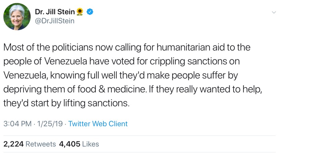 Most of the politicians now calling for humanitarian aid to the people of Venezuela have voted for crippling sanctions on Venezuela, knowing full well they’d make people suffer by depriving them of food & medicine. If they really wanted to help, they’d start by lifting sanctions.